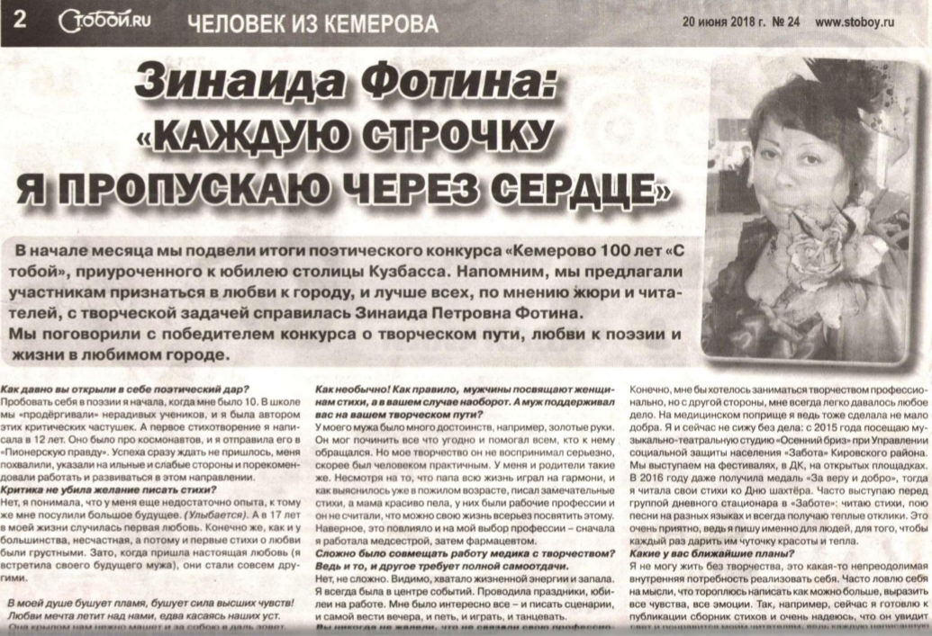 В 2018 году город Кемерово отпраздновал свое 100 –летие. В связи, с этим событием, газета «Стобой» провела поэтический конкурс «Кемерово 100 лет». По итогам отборочного тура члены жюри выделили шестерых участников, чьи произведения оказались лучшими и соответствовали заданной тематике. В числе финалистов оказались члены музыкально-театральной студии «Осенний бриз» - Герман Николаевич Вылегжанин и Зинаида Петровна Фотина. В начале июня сотрудники редакции подвели итоги конкурса, приуроченного к юбилею столицы Кузбасса. Участникам было предложенопризнаться в любви к городу, и лучше всех, по мнению жюри и читателей, с творческой задачей справилась Зинаида Петровна.Благодаря творческой деятельности, Зинаида Петровна входит в союз писателей Кузбасса.