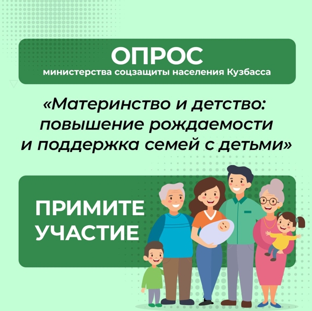 Министерство соцзащиты Кузбасса с 14 августа по 15 сентября 2023 года проводит на платформе обратной связи «Госуслуги Решаем вместе» опрос «Материнство и детство: повышение рождаемости и поддержка семей