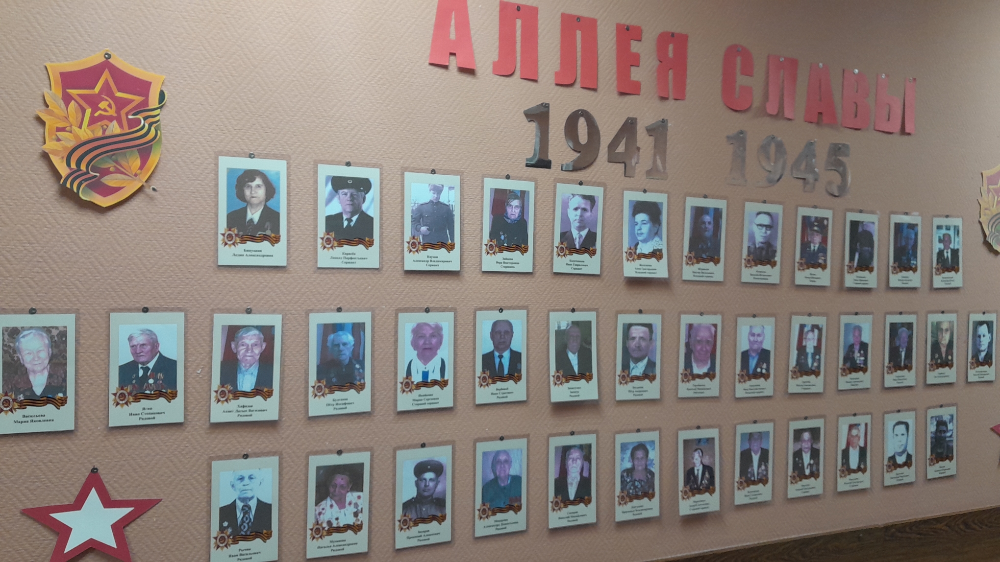 В холле КЦСОН Кировского района г. Кемерово сформирована фото-галерея «Аллея славы 1941-1945», посвященная 80-летию Победы в Великой Отечественной войне. На фото — участники-герои войны Кировского района.