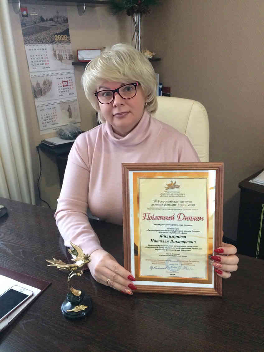 7 декабря 2019 года, в рамках Женской Ассамблеи в Москве в Большом Петровском зале Президент – отеля, состоялась церемония награждения победителей XV Всероссийского конкурса деловых женщин «Успех» 2019. Поздравляем директора МАУ «КЦСОН Кировского района г. Кемерово» Наталью Викторовну Филимонову с победой в номинации «Лучшая представительница деловых женщин России» в области социальной сферы. Наталья Викторовна была награждена Почетным дипломом и Премией общественного признания «Золотая птица».