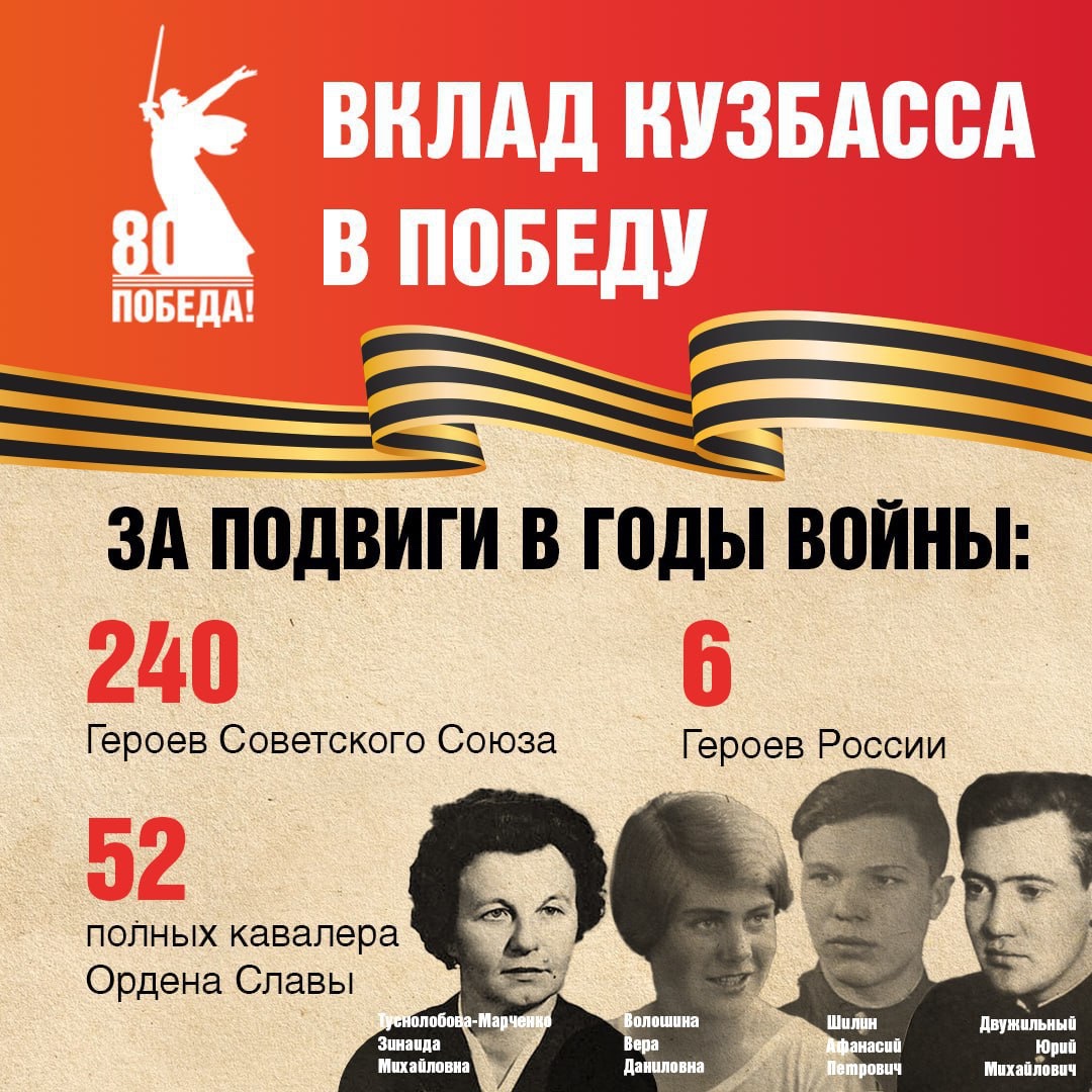 80 лет Победы: гордимся и помним! Герои-кузбассовцы в годы Великой Отечественной войны проявили невероятную храбрость и самоотверженность. Среди совершивших бессмертные подвиги – Герой Советского Союза Зинаида Михайловна Туснолобова-Марченко, фронтовая медсестра, с именем которой бойцы Красной Армии шли в атаку. Спасая солдат на поле боя, она лишилась ног и рук, ее подвиг вдохновлял людей на борьбу с врагом. Жизнь отважной разведчицы, Героя России Веры Даниловны Волошиной оборвалась во время выполнения боевого задания в самом начале войны на подступах к Москве. Тяжело раненая партизанка выдержала жестокие пытки фашистов и была казнена в один день с Зоей Космодемьянской. Это наша гордость, наша история и наша память. #80ЛЕТПОБЕДЫ #КУZБАСС